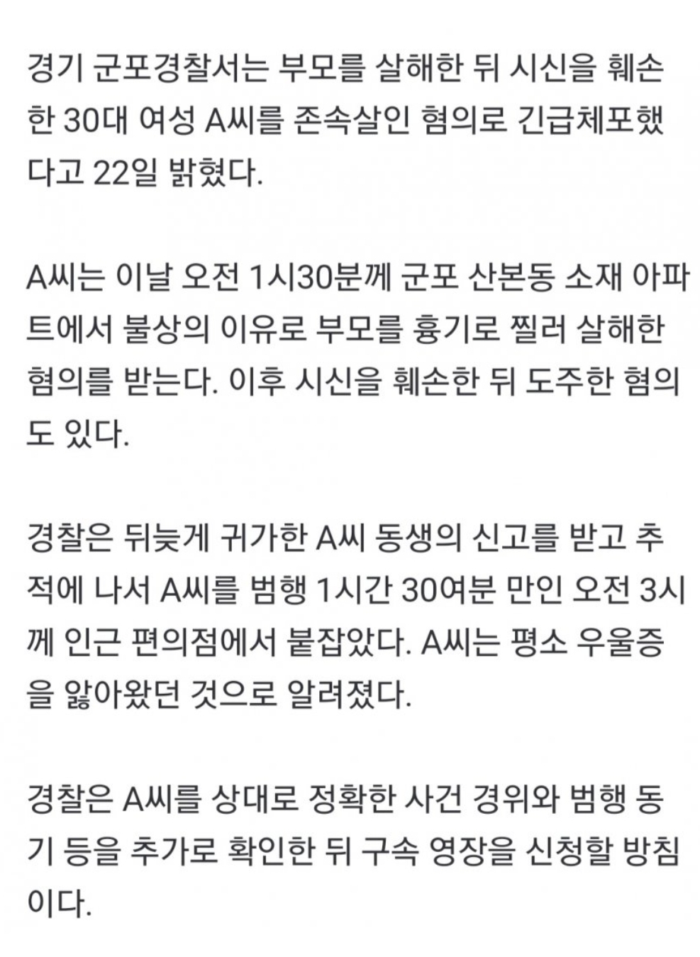 속보) 삼대녀 부모 살해 후 시신 훼손