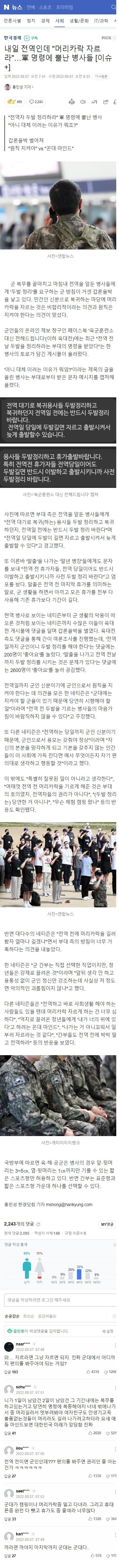 머리따위나 신경쓰는 이딴 한심한 군기로 북한군 쳐들어오면 어떻게 막겠냐? 하..진짜 한숨만 나온다