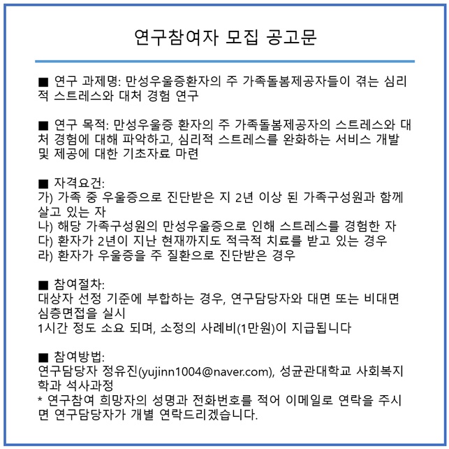 [연구 참여자 모집] 만성우울증 환자 가족 인터뷰