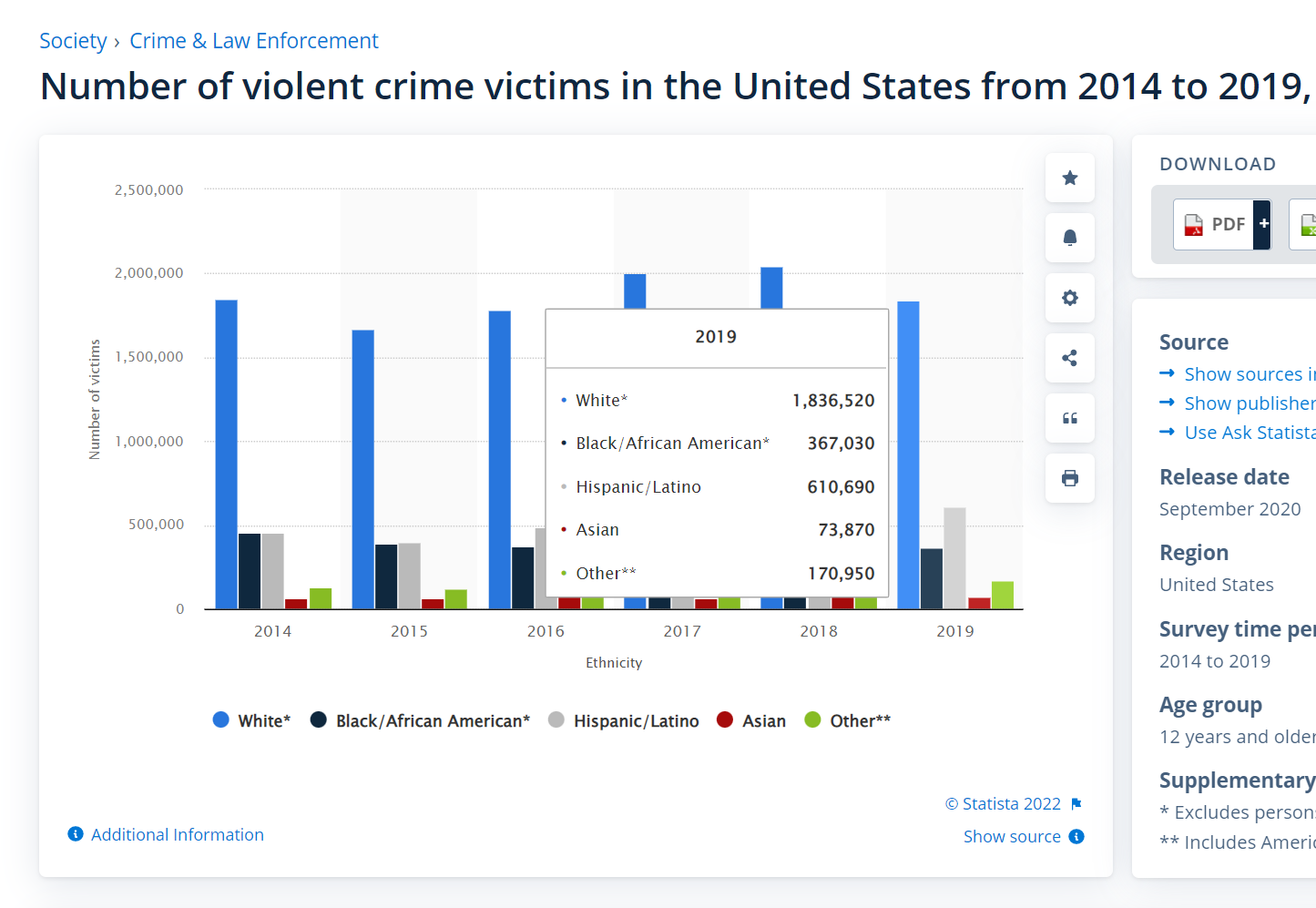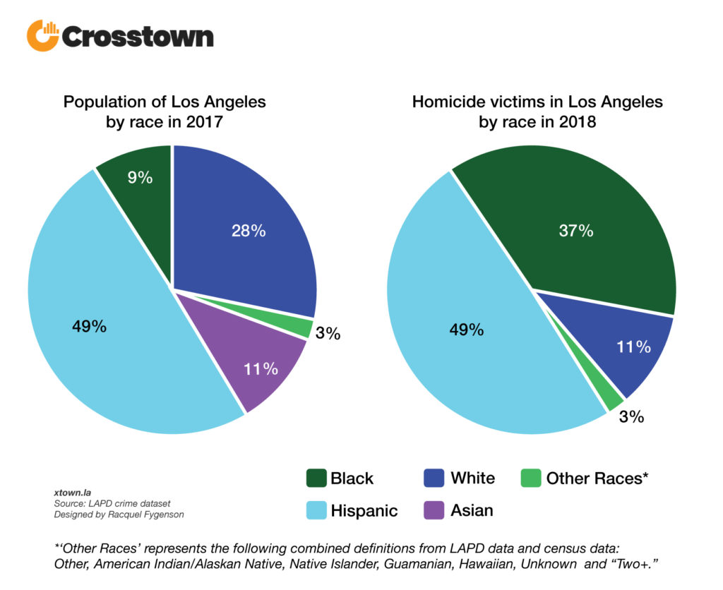 살인만으로 한정한 미국 전역의 인종별 피해자 비율은, 자료들이 너무 다 오래전꺼라서 당장은 못찾겠어서 LA한정으로 가져와봤다. 동양인은 LA에서 11%의 인구를 차지하지만, 살인 피해자 비율에서는 그냥 안보임