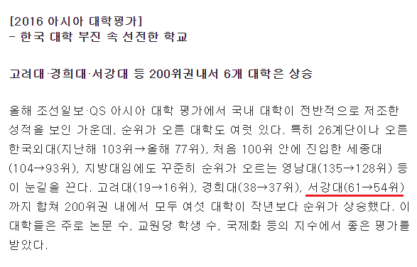 올 초에 나온 QS학문 별 순위에서는 서강대가 이대보다 처음으로 실적이 더 좋게 나온거 보면 내년 조선일보 평가에서도 이대는 꺾을 수 있을거 같아요. 이대는 저 조선일보에서 2년인가 3년 연속 하락세
