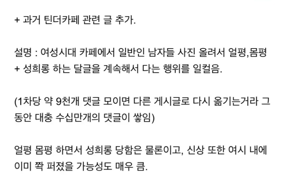 '단, 그 역할을 넘어서 본문의 주장처럼 그저 얼평,몸평만하는 글이 하나라도 섞여있으면 심각한문제라고 생각함. 근데 올린짤만보면 그런글은 없어서 일단 난 욕하는거 보류'