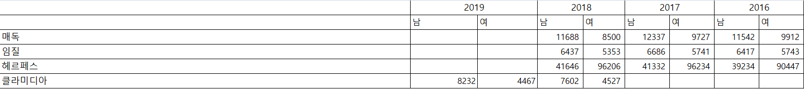 일본자료와 마찬가지로 2018,2017,2016 3개년을 볼 것이다. (클라마디아의 경우는 2019,2018년을 가져와서 연도를 일본자료와 맞추겠다)
