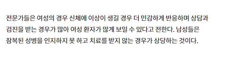 p.s. 그럼 여성이 남성이 왜 전체성병은 2배냐라고 물을 수 잇는데 전체성병에서 '기타성병'이 30-50%로 가장 큰 비율을 차지하고 있다. 이 '기타성병'에서 여성환자의 비율이 남성보다 훨씬 많기때문에 전체성병비율에서 여성이 남성의 2배로 보이는 것이다.