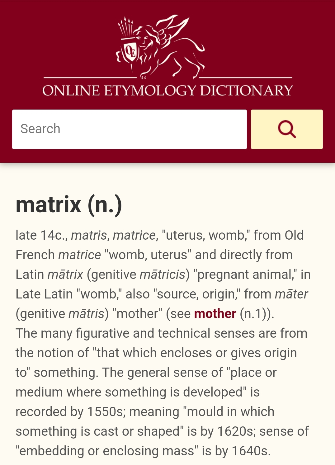 이 프랑스 matrice 단어는 임신한 동물, 자궁, 기원을 뜻하는 라틴어 mātrix에서 왔고