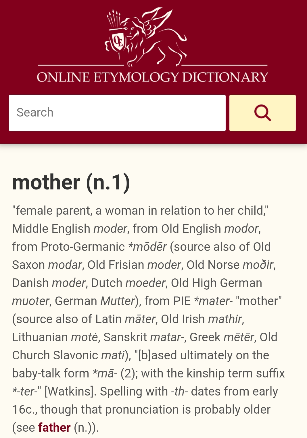 선사 게르만어에서 mōdēr, 고대 아일랜드어에서 mathir, 고대 리투아니아어에서 motė, 산크리스트어에서 matar, 고대 그리스어에서mētēr, 고대 슬라브어에서 mati