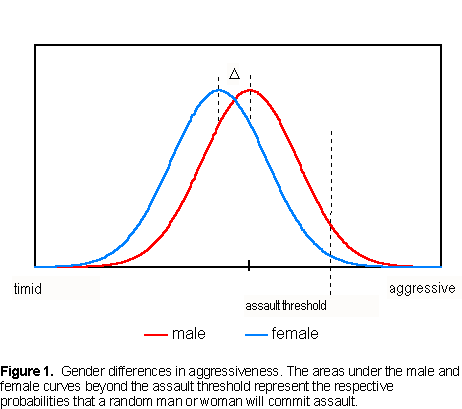 그러나 평균 점수가 남자가 약간 더 높음. 따라서 '가장' 공격적인 성향을 가진 사람들(=범죄자)의 성별을 골라 보세요 하면 거의 다 남자임.