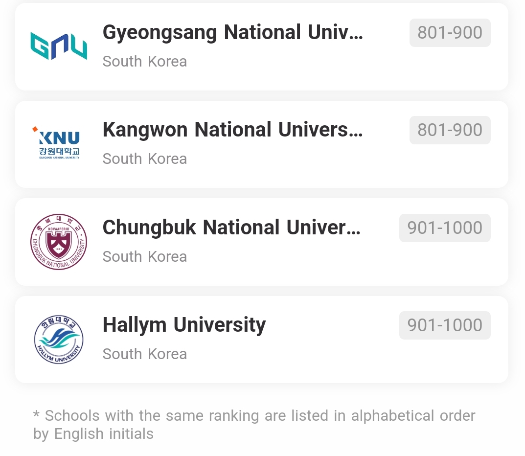 가장 밑에 * 표시로 써있는 것처럼 같은 000~000위에서는 알파벳 순서니까 왜 한양대가 카이스트보다 높냐고 하지마