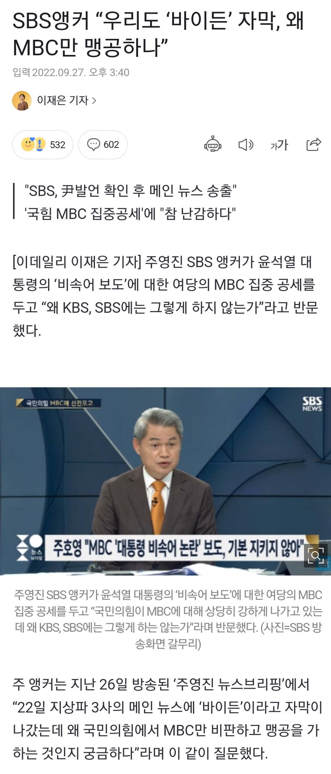 지금 기사 보면 주영진 이 빨갱이놈이 mbc 편 들고 sbs도 똑같이 조져달라고 하는 거잖아. 눈깔 없냐?