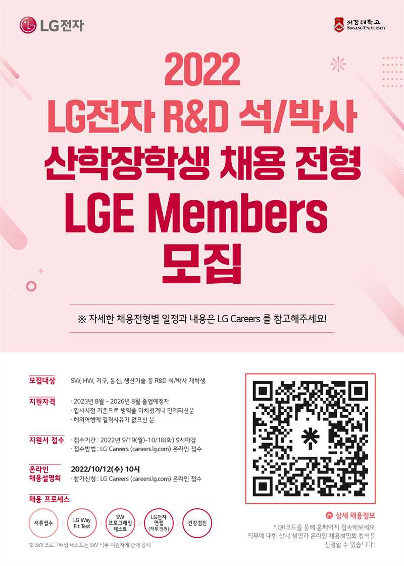 이번 하반기에도 LG전자에서 R&D 석/박사 산학장학생을 채용한다고 하여 학우님들께 공유드립니다
