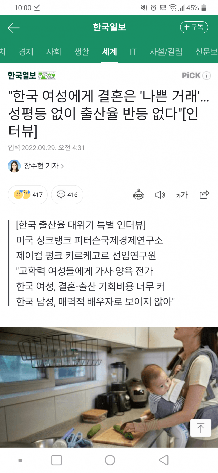 물론 서양 기준으로 아직 부족한건 맞지만 지수는 개선되어가고 있는데(=점점 더 성평등해지고 있는데) 출산율은 떨어지고 있음. 즉 현재 상황은 성평등만의 문제가 아님.