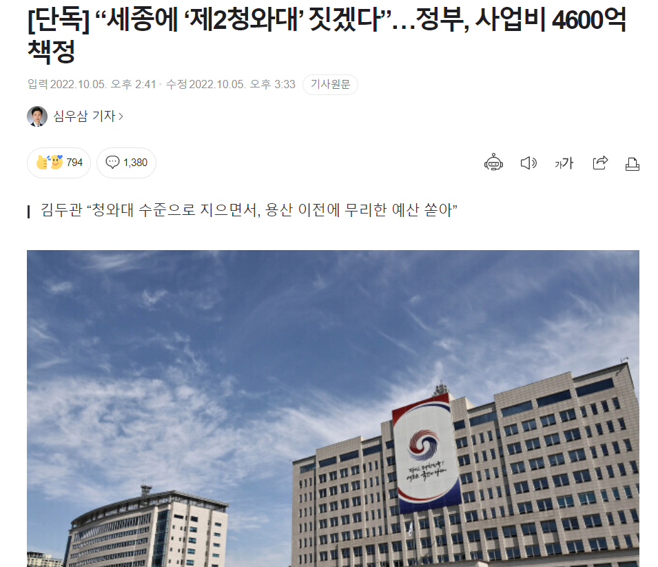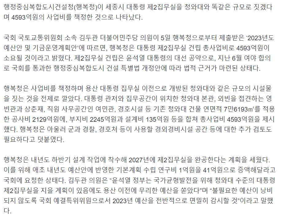에이 말이 됨? 제2집무실이면 보조 개념인데 용산보다 작게 지어야지. 대통령 보좌 기관이 다 용산에 있는데 왜?