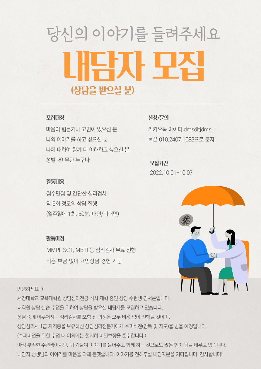 방식: 대면(서울 지역, 교내, 내담자와 논의)으로 진행되나 상황에 따른 비대면 병행 가능