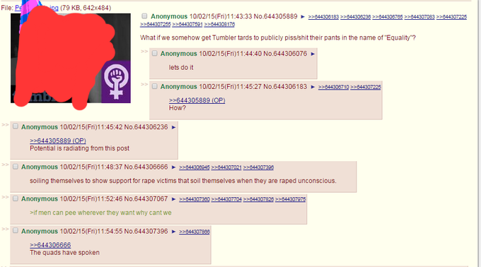 작전을 세운 이들은 즉시 트위터, 페이스북, 텀블러 등 페미니스트들이 서식하는 곳에 수백개의 가짜 여성계정을 생성하고 #PissForEquality(=#평등을 위해 오줌을 싸자!)라는