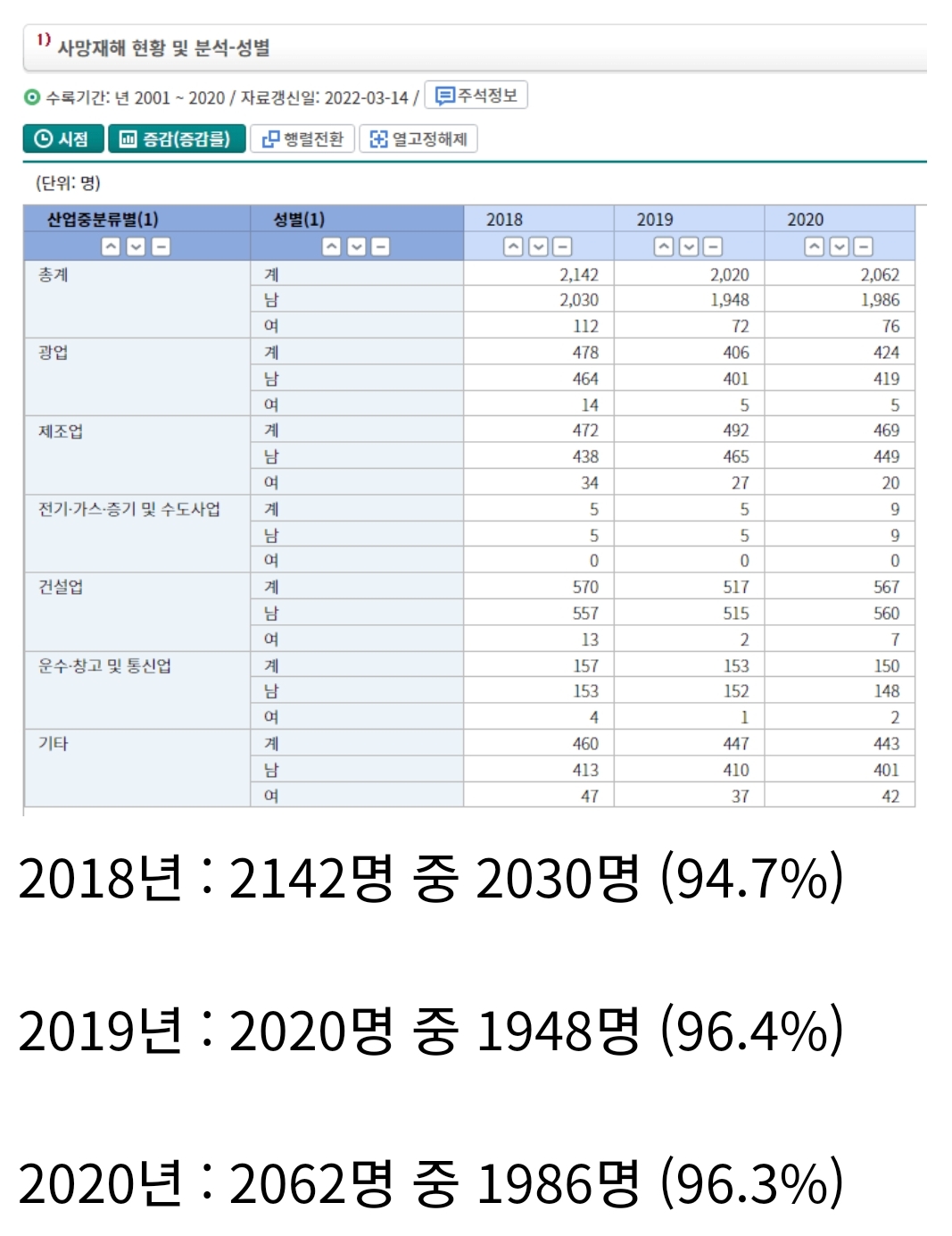 산업재해 사망자분들 통계 보면 절대 다수가 남성인데 이제까지 아무도 관심 없었는데