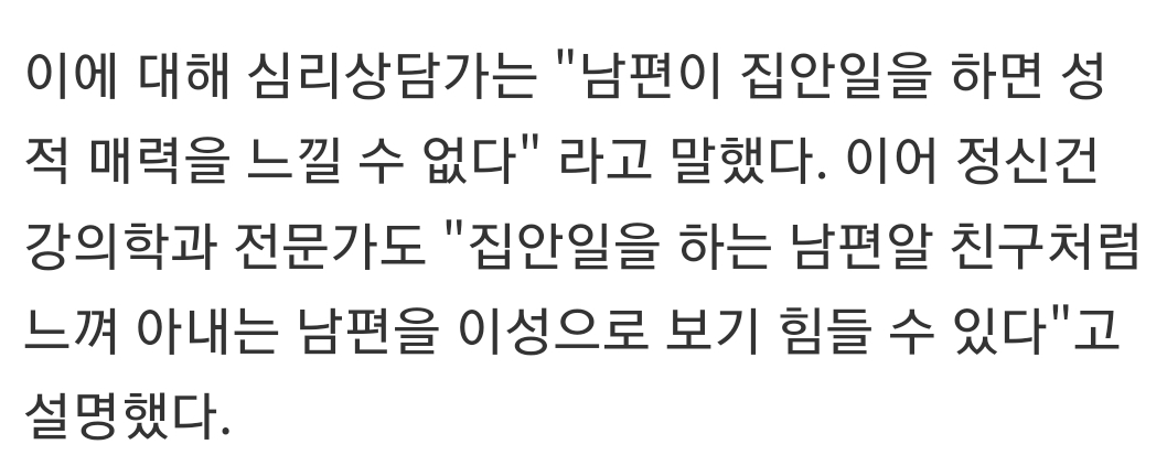 진화심리학적으로 이성에관한 감정을 성적 매력/순수 매력/비호감 이렇게 3가지로 나눈다고 하면, 집안일을 도와주는 남자에게 여자는 순수 매력을 느끼는거지 성적매력을 느끼는게 아니라는거.