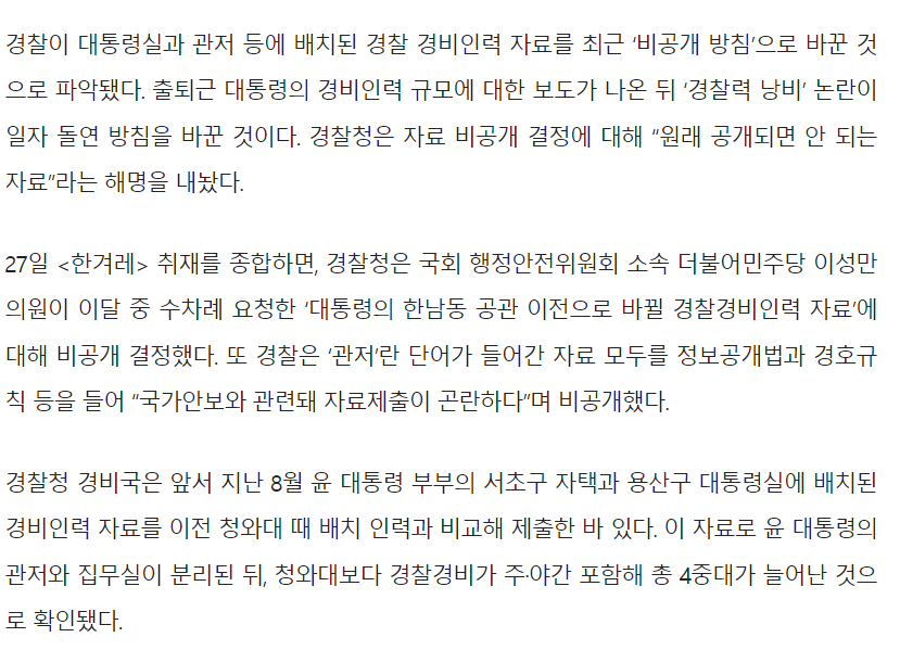 ‘윤 출퇴근’ 경찰인력 자료 돌연 비공개…‘관저’ 들어간 모든 자료도