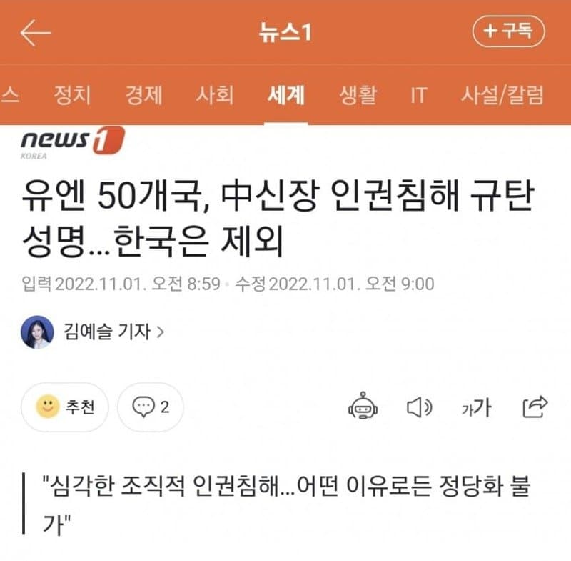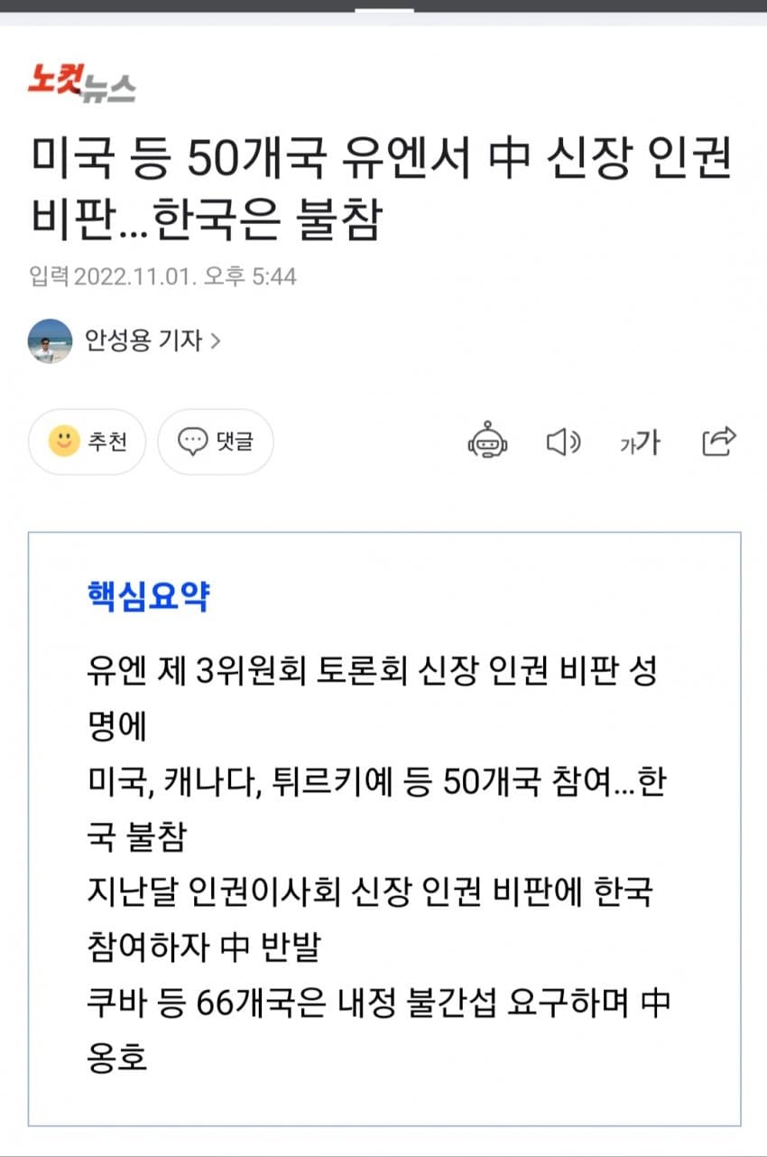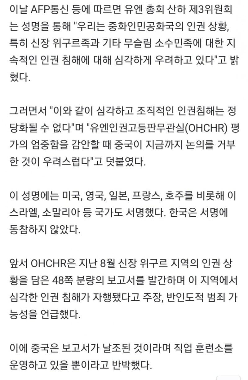 지난달 중국 신장위구르 인권 상황에 대한 유엔 인권이사회의 결정안 표결에는 찬성 투표 던졌음