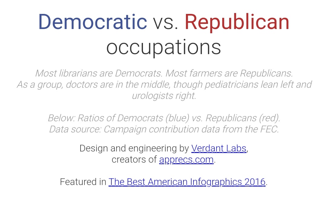 민주당 공화당 각 정당에게 들어가는 정치 기부금을 내는 시민들의 직업을 총 취합해서 통계낸 자료.