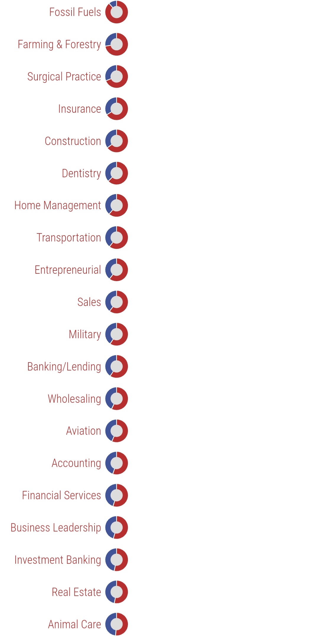 - 경제학과 관련있는 보험업, 금융업, 투자업 종사자들은 공화당 지지가 높으며, 사업가와 기업 임원 역시 공화당 지지율이 높다.