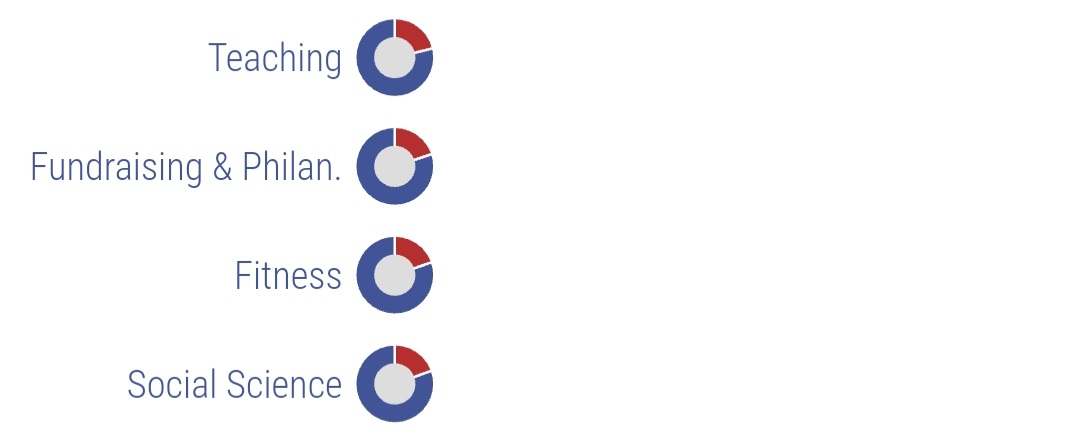 - 마케터, 디자이너, 건축 디자이너, 교사, 사회과학자, 예술가, 가수, 배우, 자영업자(retail trade), 일반 회사원(business operation&support staff), 요식업 종사자, 기술직(skilled trade), 간호사&물리치료사 등 병원 직원(medical service), 상담치료사, 스포츠 마케터 등 스포츠 관련 종사자,