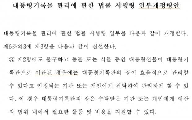 개정안엔 ‘대통령기록물생산기관장(대통령 비서실장)이 동물 또는 식물 등이어서 다른 기관에서 관리하는 것이 효율적이라고 인정되는 대통령선물은 다른 기관의 장에게 이관하여 관리할 수 있도록 한다’는 신설조항도 포함됐다. 문 전 대통령의 임기가 끝난 이후에도 풍산개들의 관리방안까지 염두에 두고 개정안을 마련했다고 볼 수 있는 대목이다.