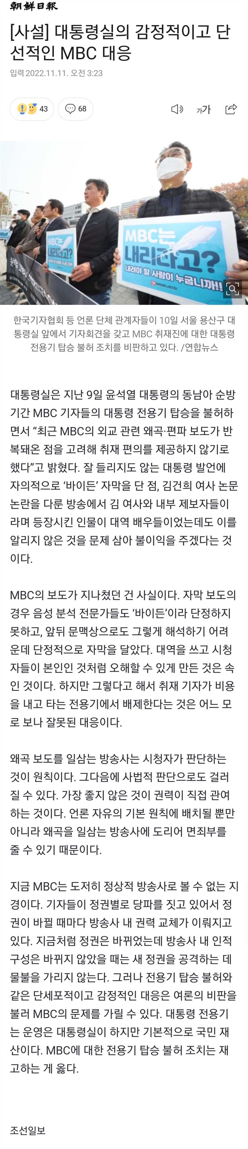 조선일보 "MBC 전용기 탑승 불허 조치는 단세포적인 대응"