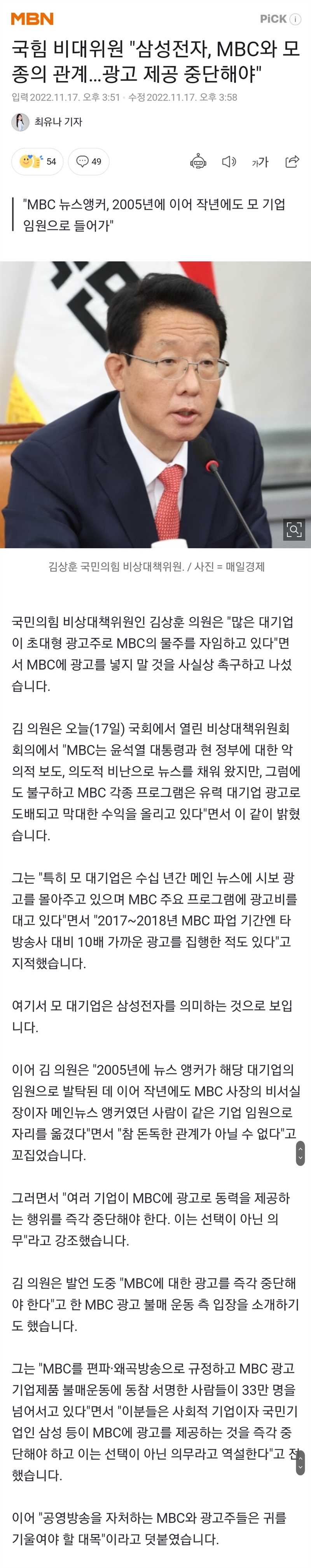 "편파, 왜곡방송인 MBC는 유력 대기업(특히 삼성전자) 광고로 막대한 수익을 올리고 있다. 이런 MBC에 광고를 제공하는 행위를 즉각 중단해야 하고 이는 선택이 아닌 의무이다. 이래도 계속 광고하면 광고기업 불매운동도 불사하겠다."