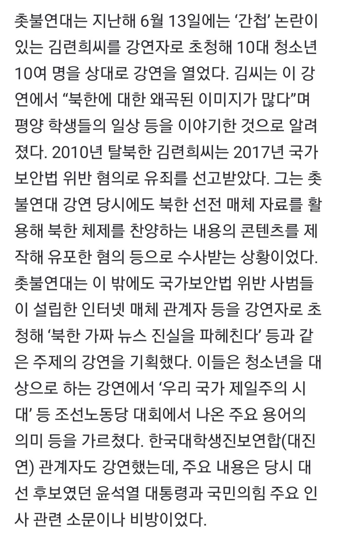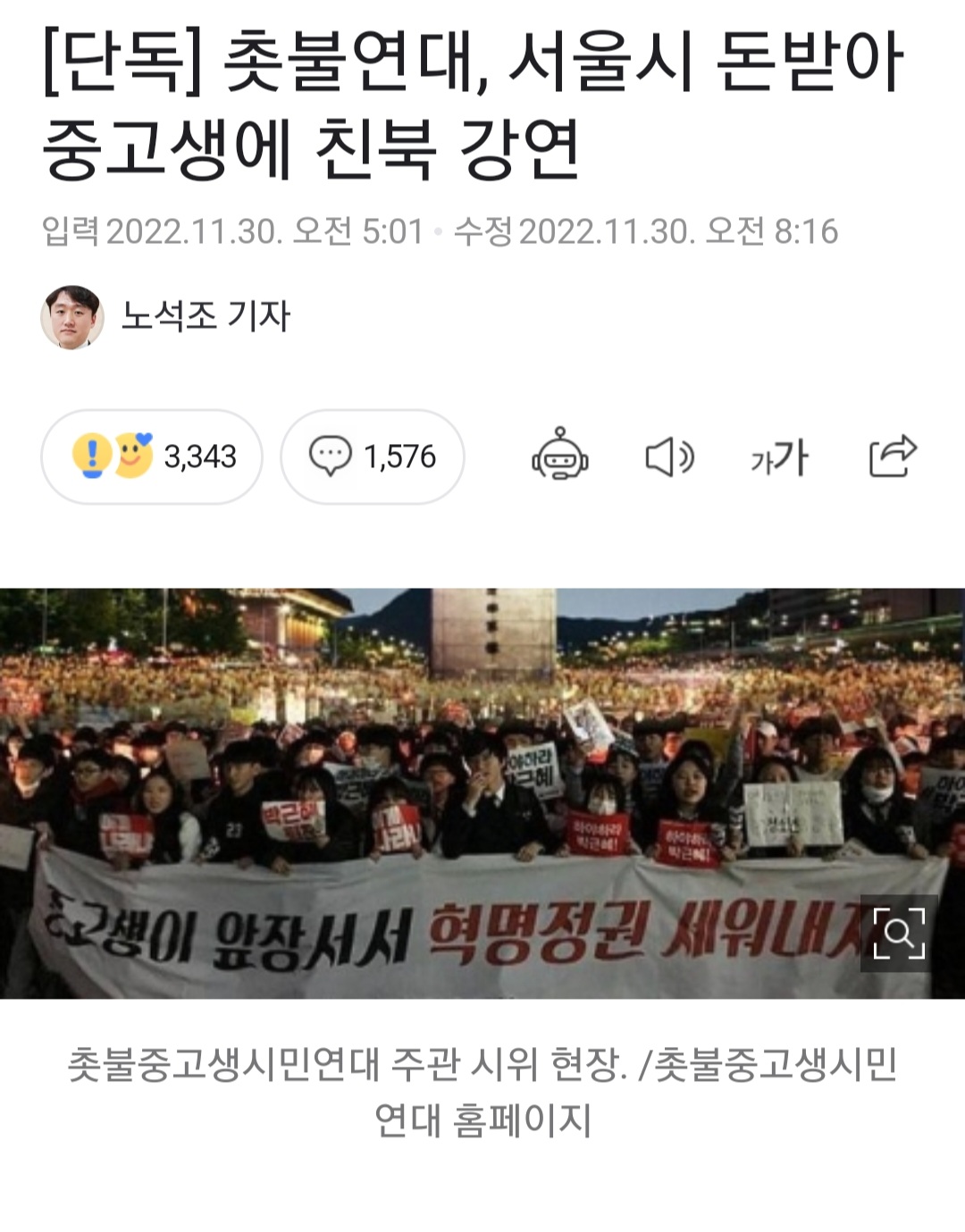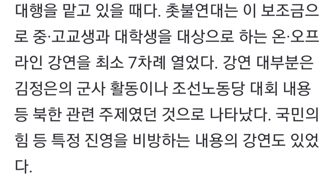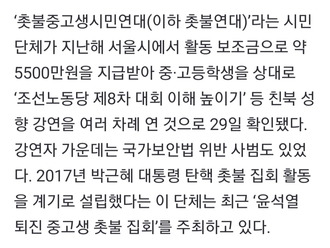보조금으로 중고등학생들에게 북한 찬양하는 교육 시킴 심지어 강연자는 국보법 위반한 사람이고ㅋㅋㅋㅋㅋ