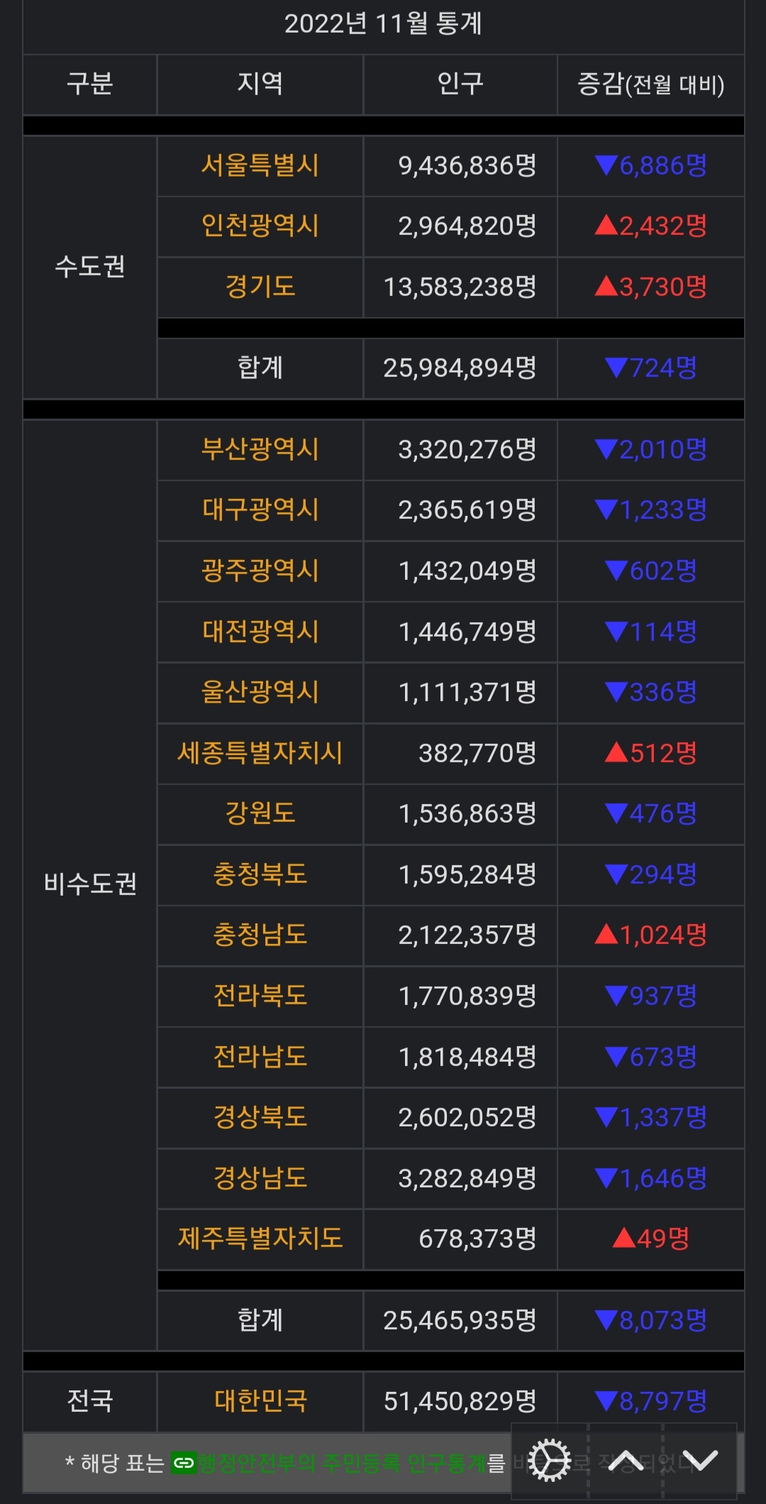 11월 지역별 인구증감 현황