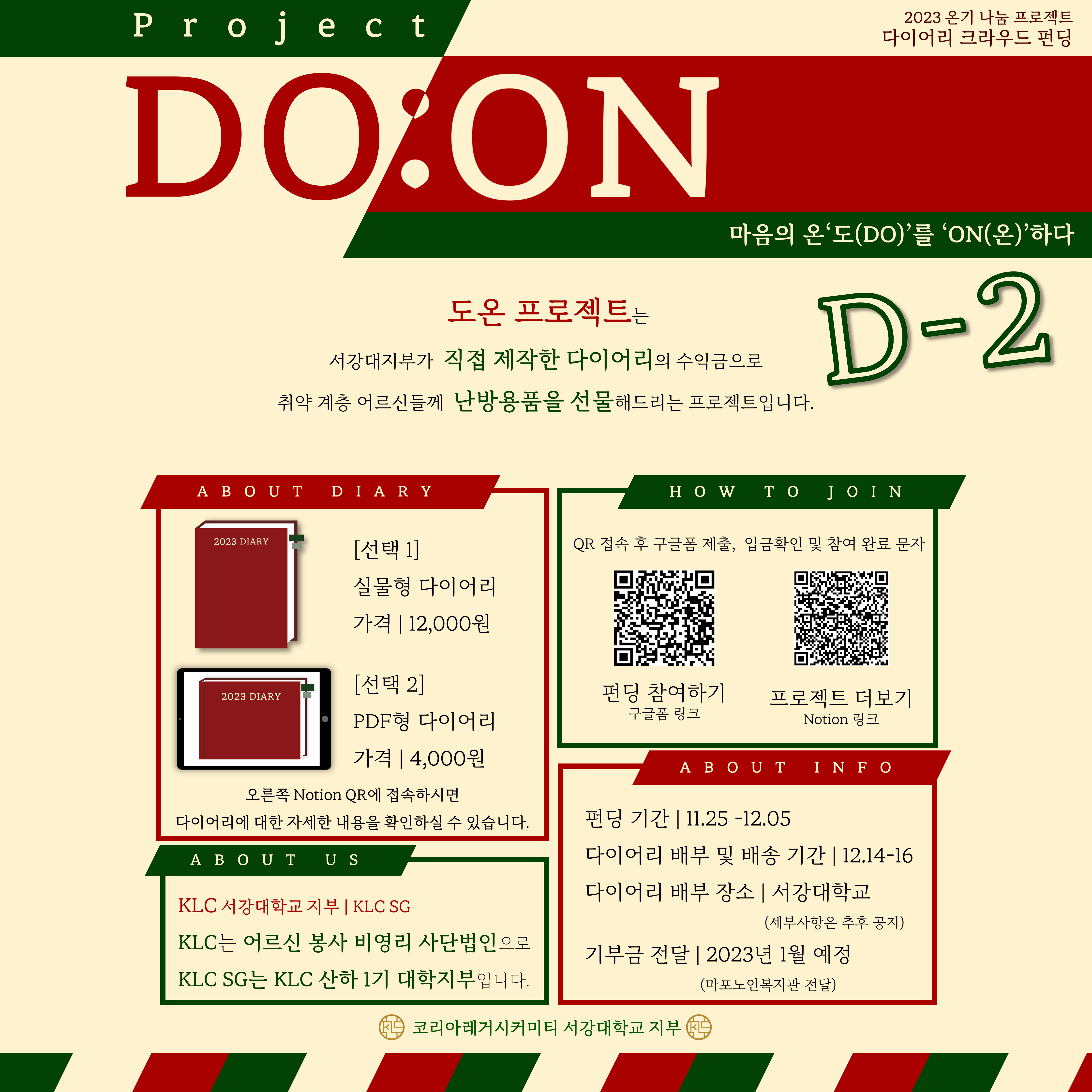 DO:ON 프로젝트는 여러분의 2023년을 응원하는 다이어리를 서강대지부가 직접 제작하여 판매하고, 판매 수익금을 어르신들의 방한용품 마련을 위해 "100% 전액" 마포노인종합복지관에 기부하는 방식으로 진행됩니다.