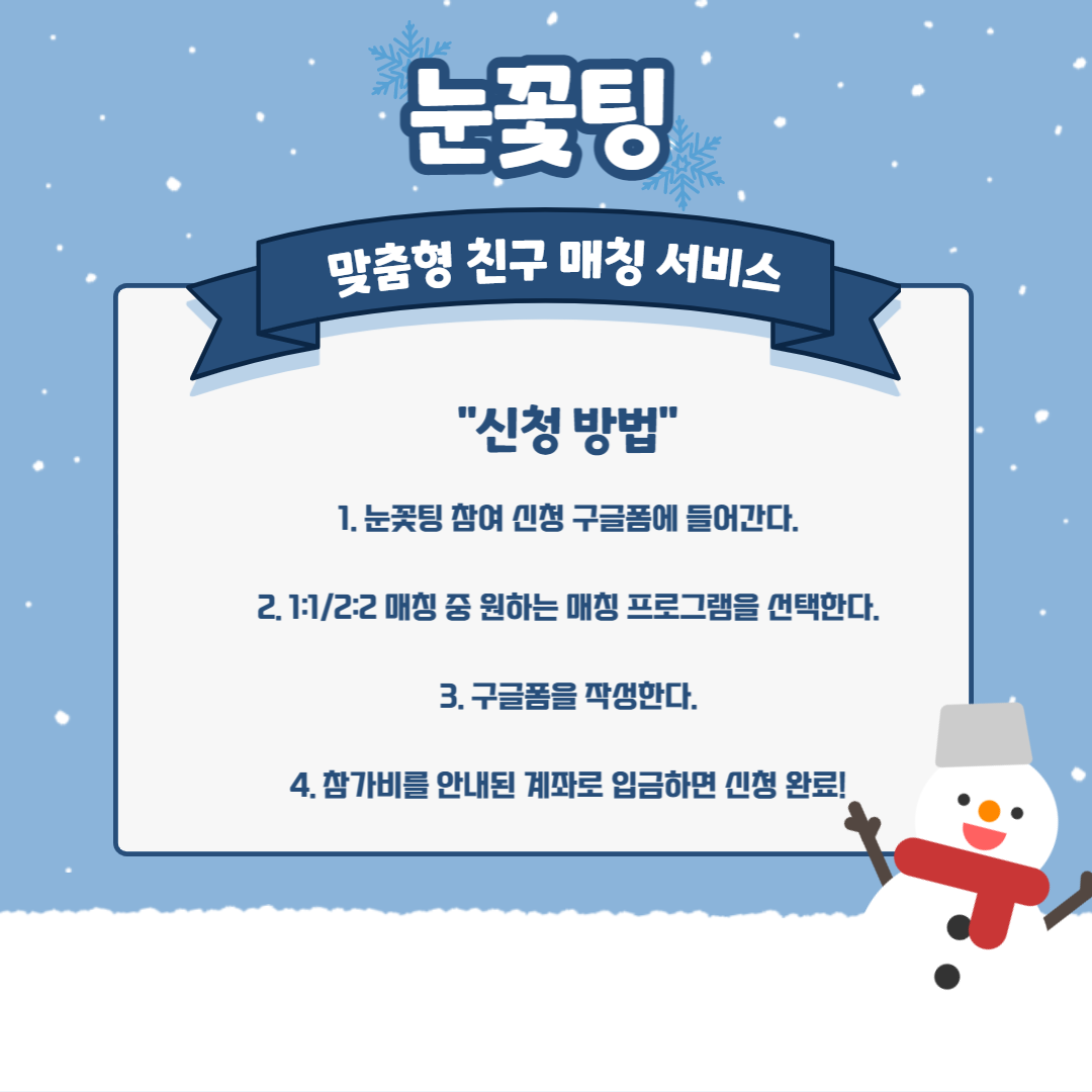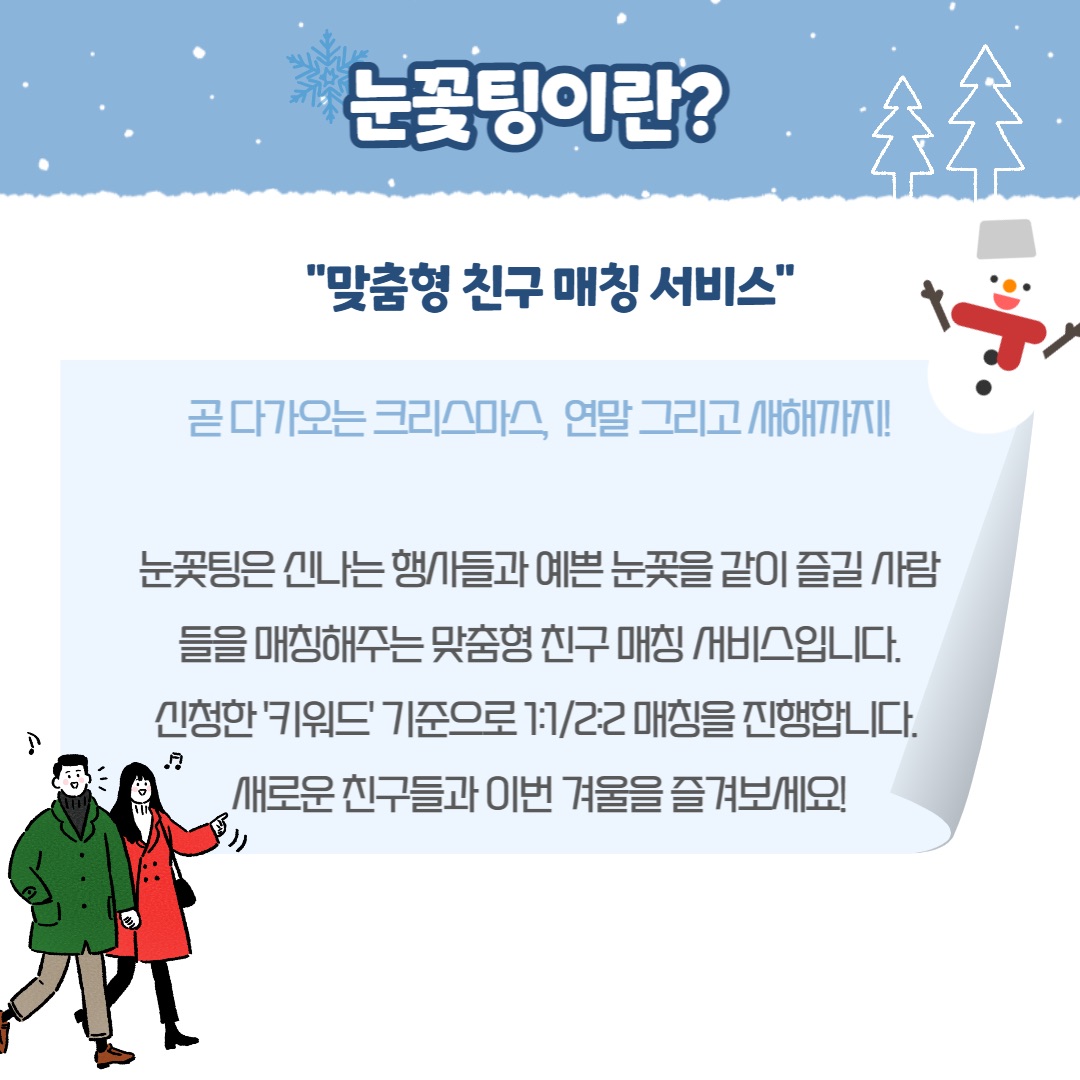 안녕하세요! 눈꽃팅은 벚꽃팅, 단풍팅에 이어 시즌별로 운영하고 있는 맞춤형 친구 매칭 서비스입니다.