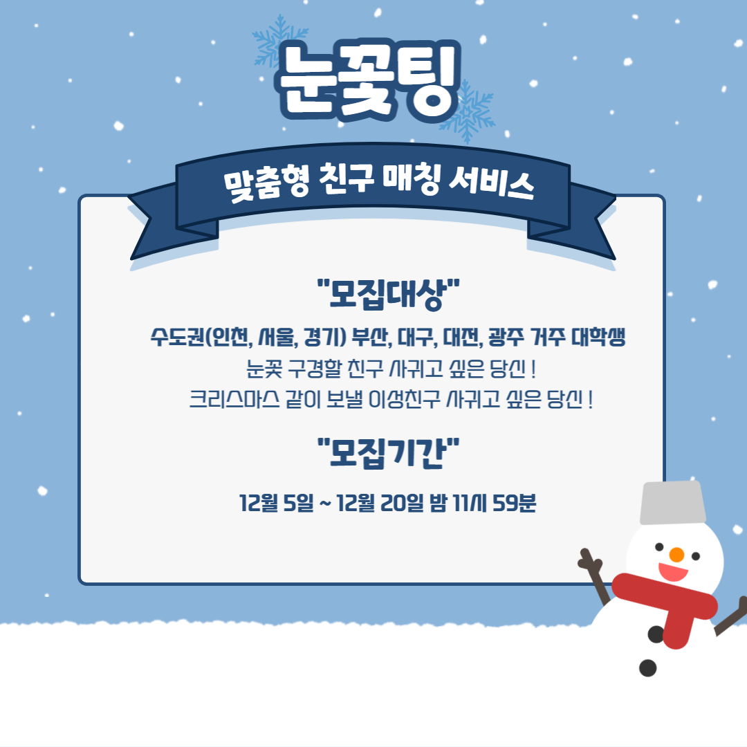 - 곧 다가오는 크리스마스, 연말 그리고 새해까지! 예쁜 겨울 눈꽃을 같이 즐길 사람들을 매칭시켜주는 맞춤형 매칭 서비스로 신청한 키워드를 기준으로 1:1 or 2:2 매칭을 진행합니다.