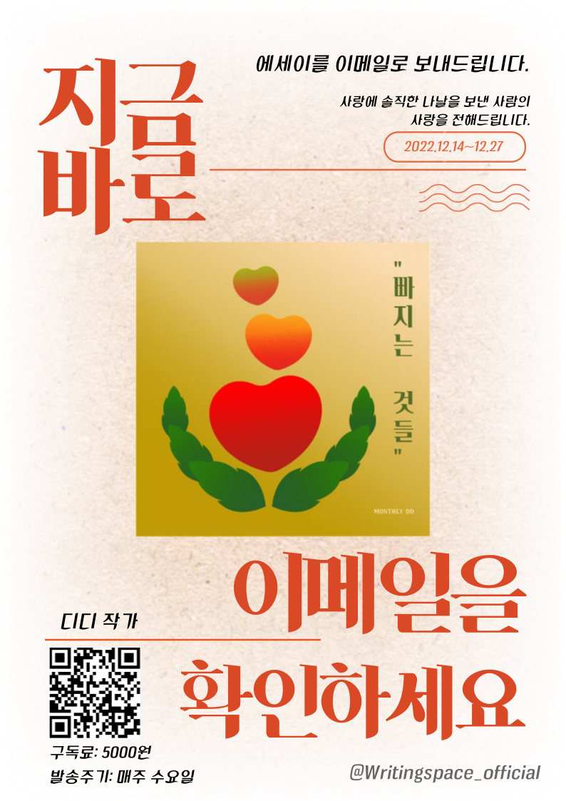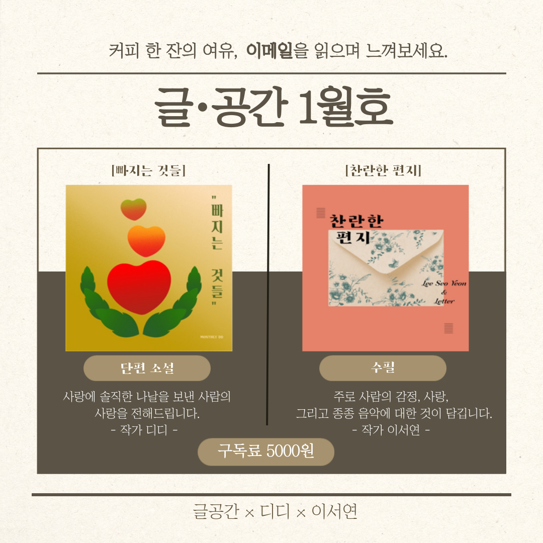 이번에 ‘글∙공간’이 ‘디디’ 작가님, ‘이서연’ 작가님과 함께 협업을 진행하게 되어 메일을 보내드릴 독자님들을 찾습니다.