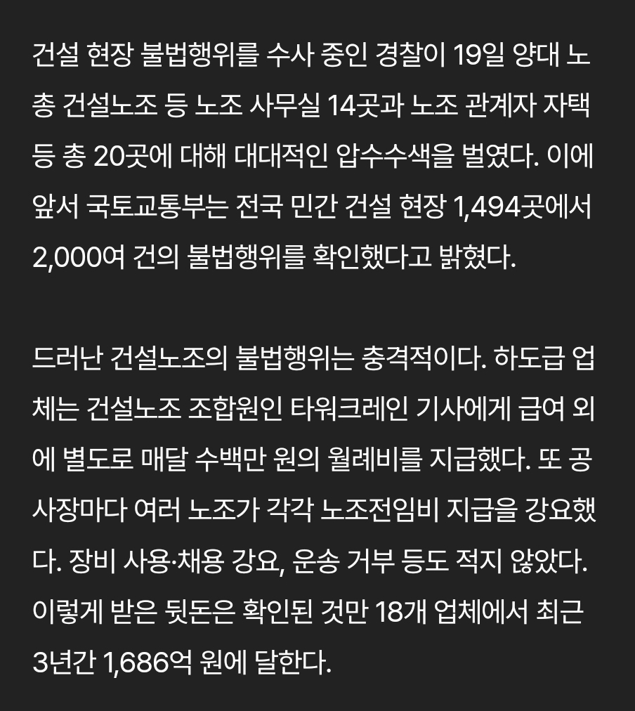 노조새끼들 깡패짓하고 다닌 게 하루이틀이 아니고, 이건 현장 나가본 적 있으면 모를 수가 없다. 그런데 건설노조 실드를 친다? 이건 건설현장 관련해서는 ㅈ도 모르는거지. 이렇게 패악질이 드러난 걸 보고도 노조편인지는 모르겠는데 일단 모르는 것에 대해 욕부터 박고 시작하는 그 태도는 고치길 바란다.