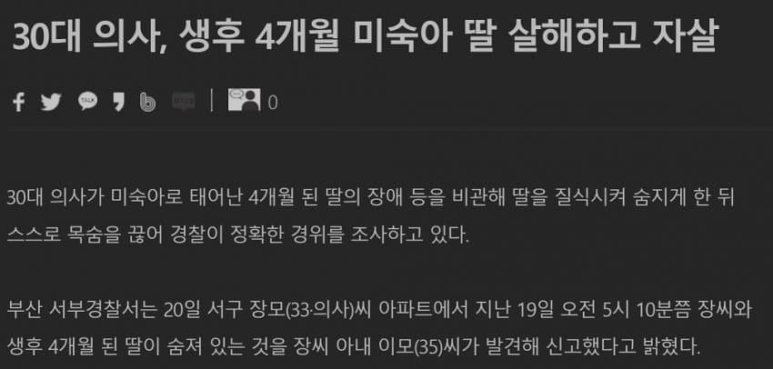 30대 의사가 4개월된 장애인 딸 살해하고 자살…