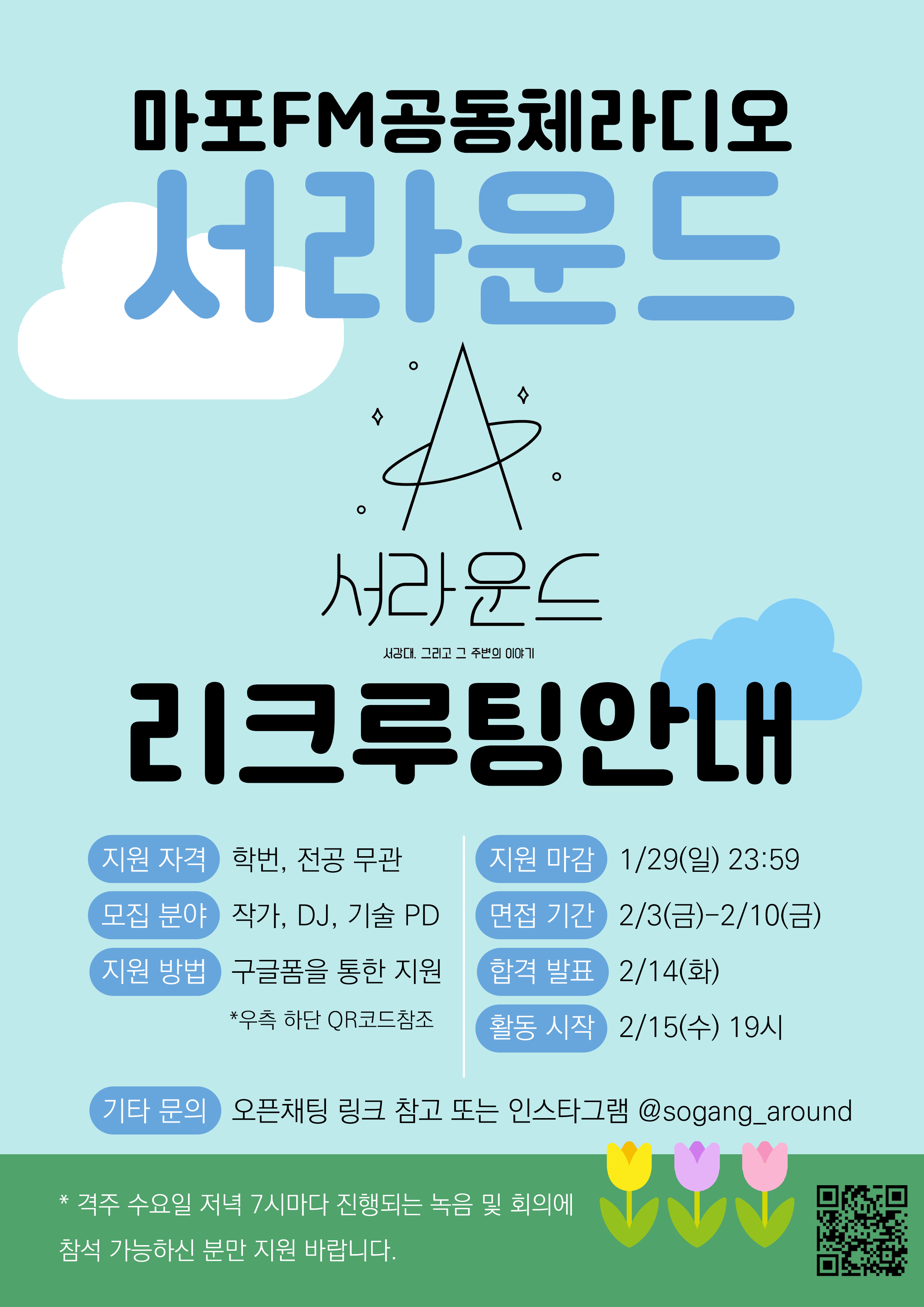 마포FM에서 서강대학교의 이야기를 자유롭게 풀어 나갈 라디오팀 <<서라운드>>의 팀원을 모집합니다!