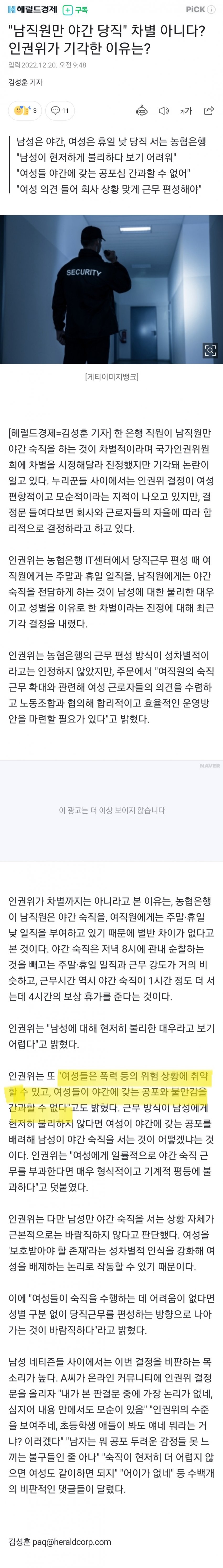 "남직원만 야간 당직" 차별 아니다? 인권위가 기각한 이유는?