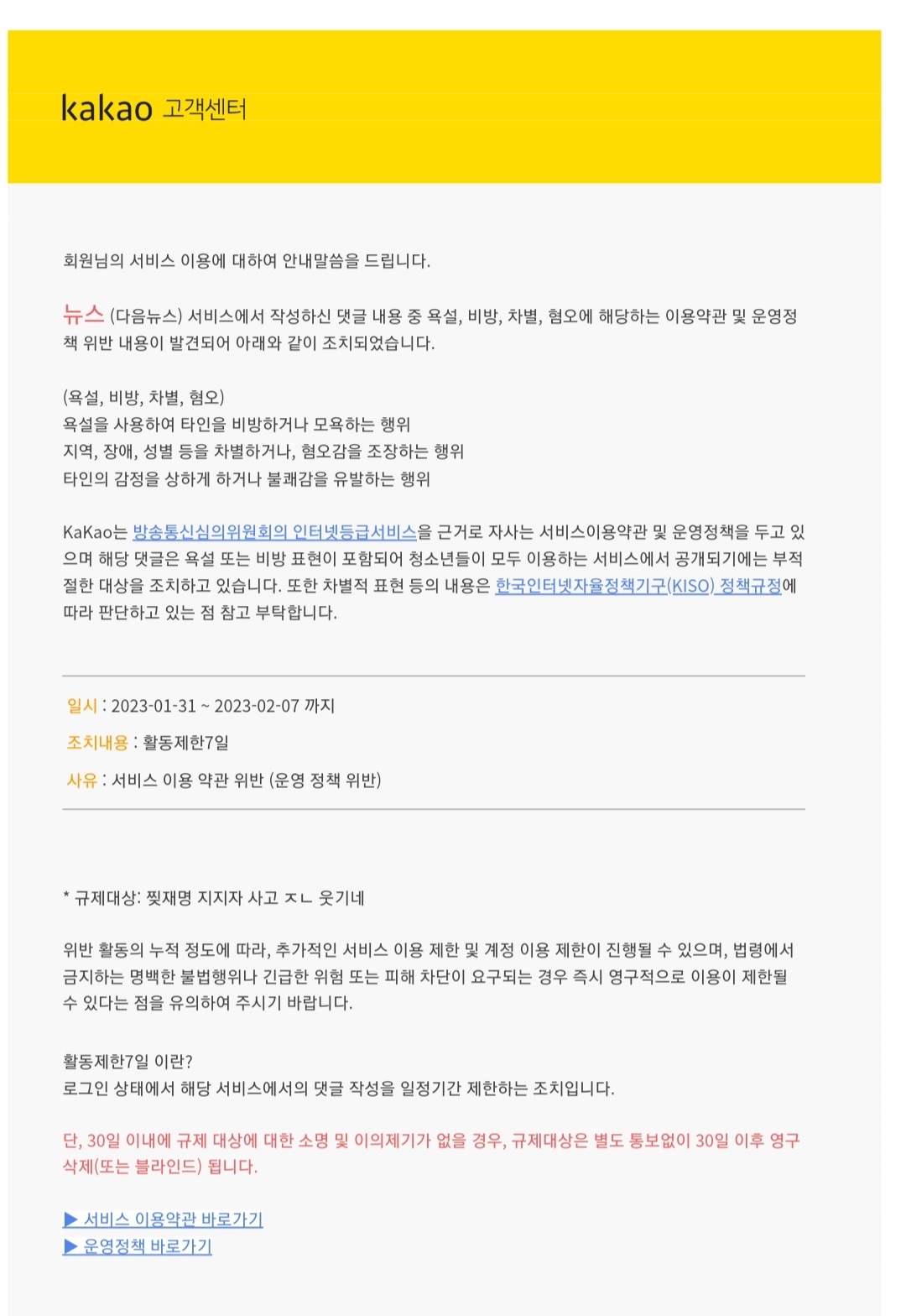 저건 걍 신고가 많이 들어와서 정지 먹은 거임. 다음이 일일이 댓글 찾아보고 규제하는게 아니고.
