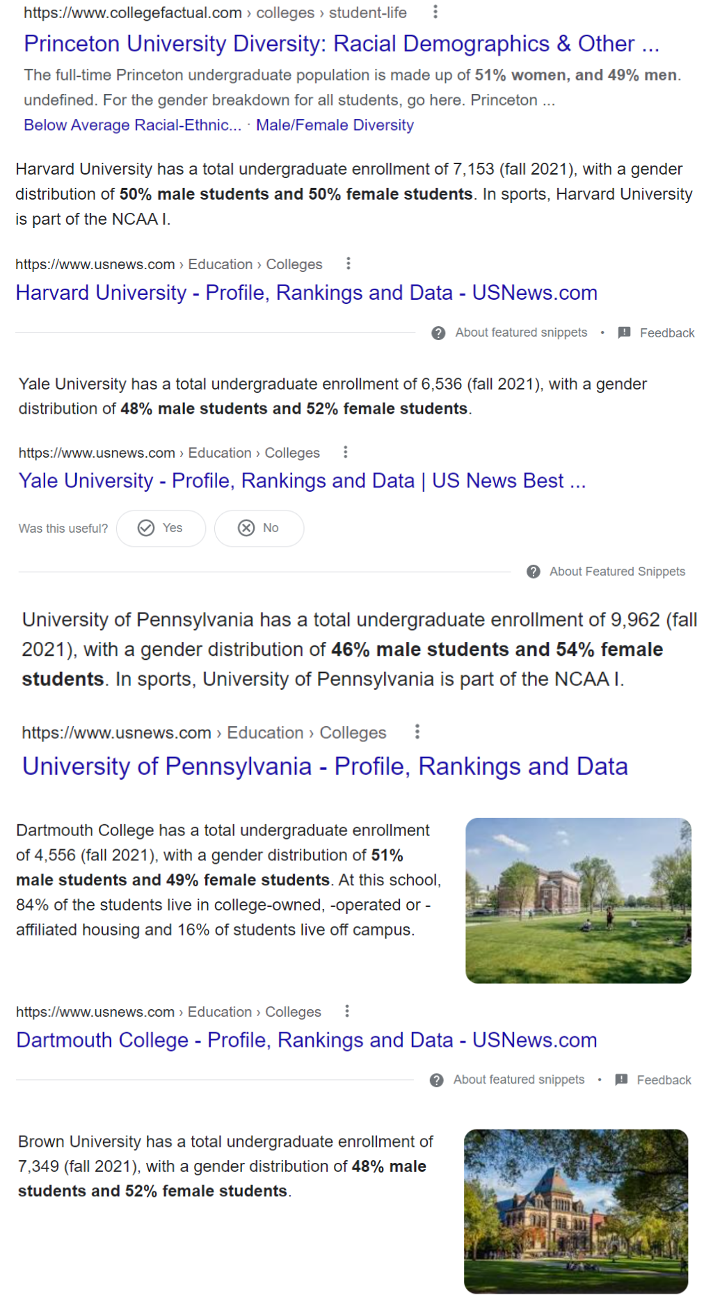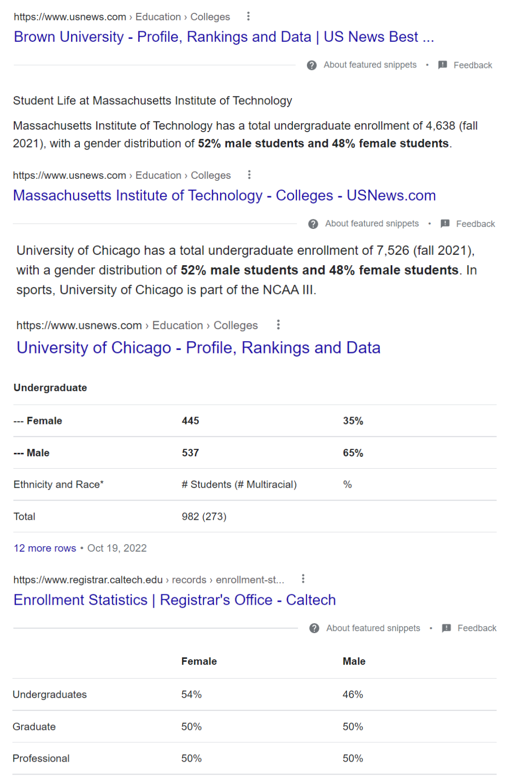 미국 Top 20 굴지의 초명문 대학들의 성비를 보면 거의 전부 5대5거나 오히려 여자가 약간 더 많은걸 알 수 있음