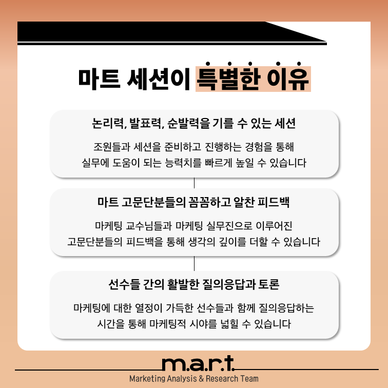 매 학기 금요일 오후 5시, M.A.R.T. 세션이 있습니다