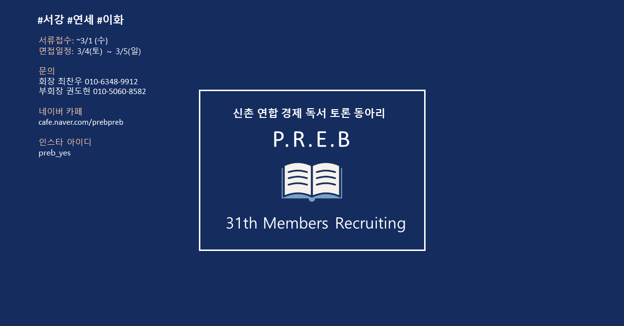 [D-2/마감임박!!]서강&연세&이화 신촌연합 경제독서토론 동아리 P.R.E.B에서 31기 동아리원을 모집합니다!