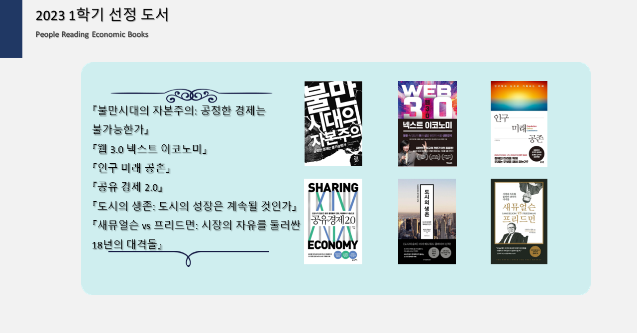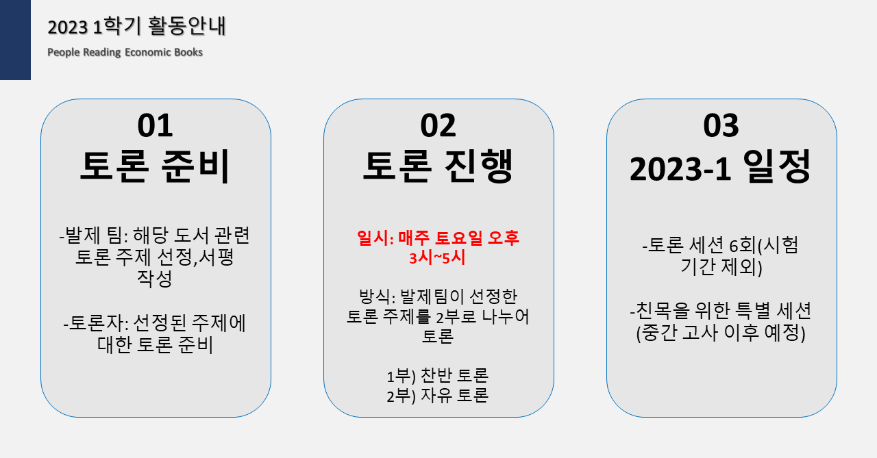 한 학기동안 총 6권의 경제 관련 도서를 읽고 토론합니다. 매주 토요일 오후 3-5시에 신촌 소재 스터디룸/학교 대관 장소 에 모여 미리 선정한 주제에 대한 토론을 진행합니다. (1부: 찬반토론, 2부: 자유토론)