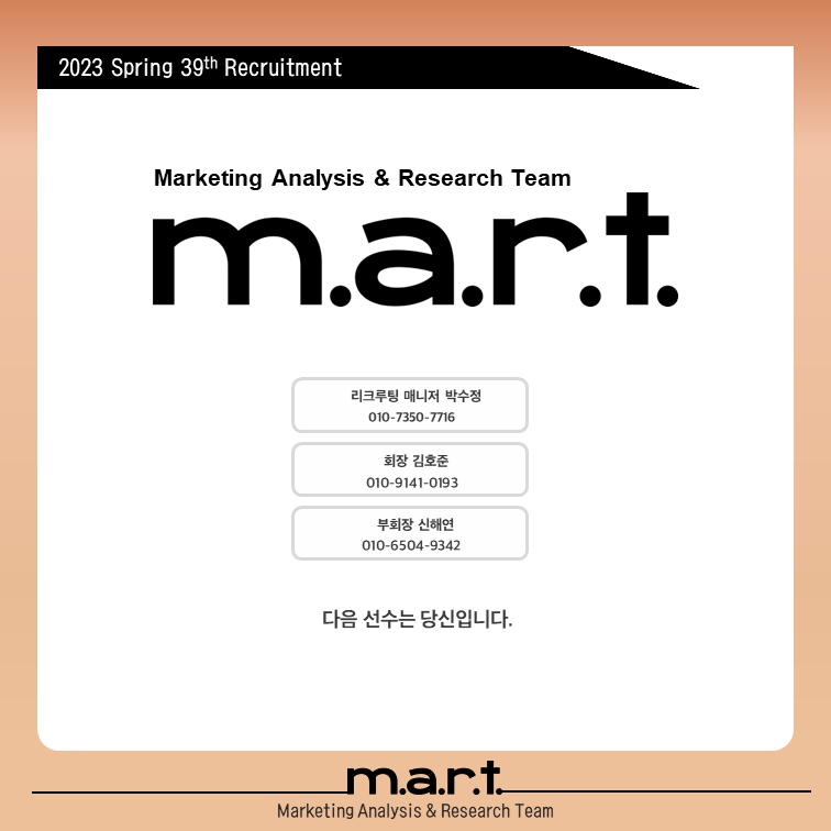 M.A.R.T. 39기 리크루팅 온라인 설명회가 3/3일 금요일 오후 6시 30분에 줌으로 진행됩니다.