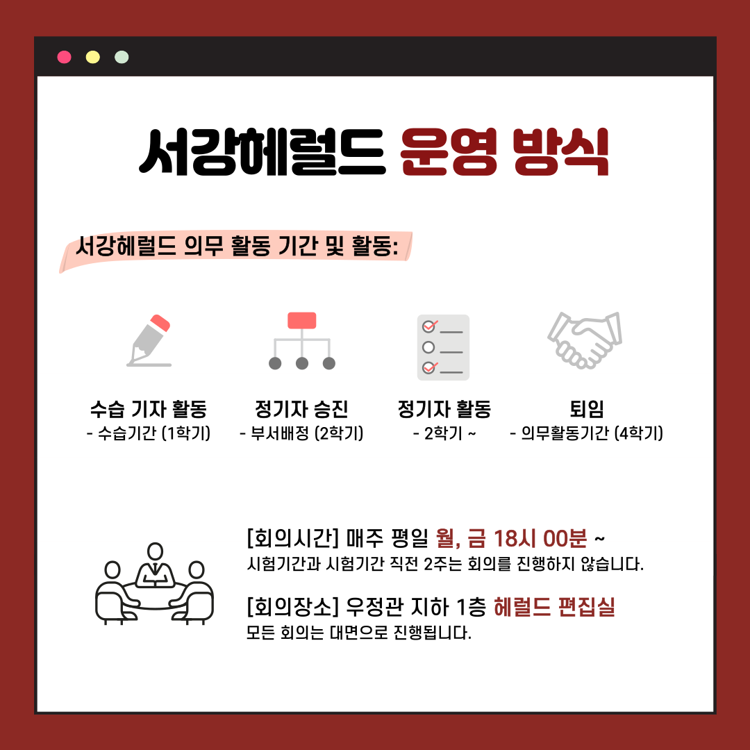 회의장소: 모든 회의는 대면으로 우정관 지하1층의 헤럴드 편집실에서 진행됩니다.