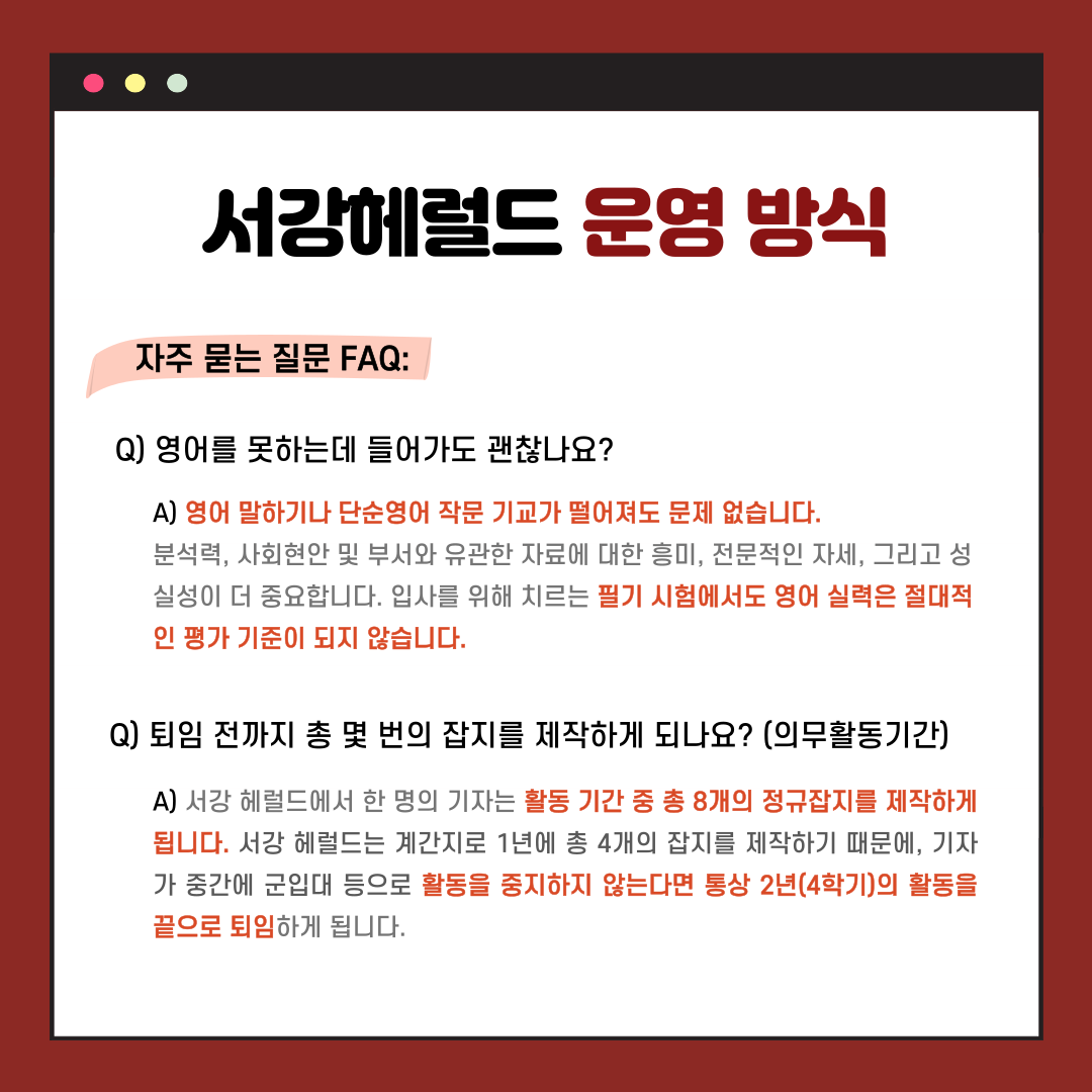 Q. 서강 헤럴드에서 퇴임 전까지 총 몇 번의 잡지를 제작하게 되나요?(의무활동기간)