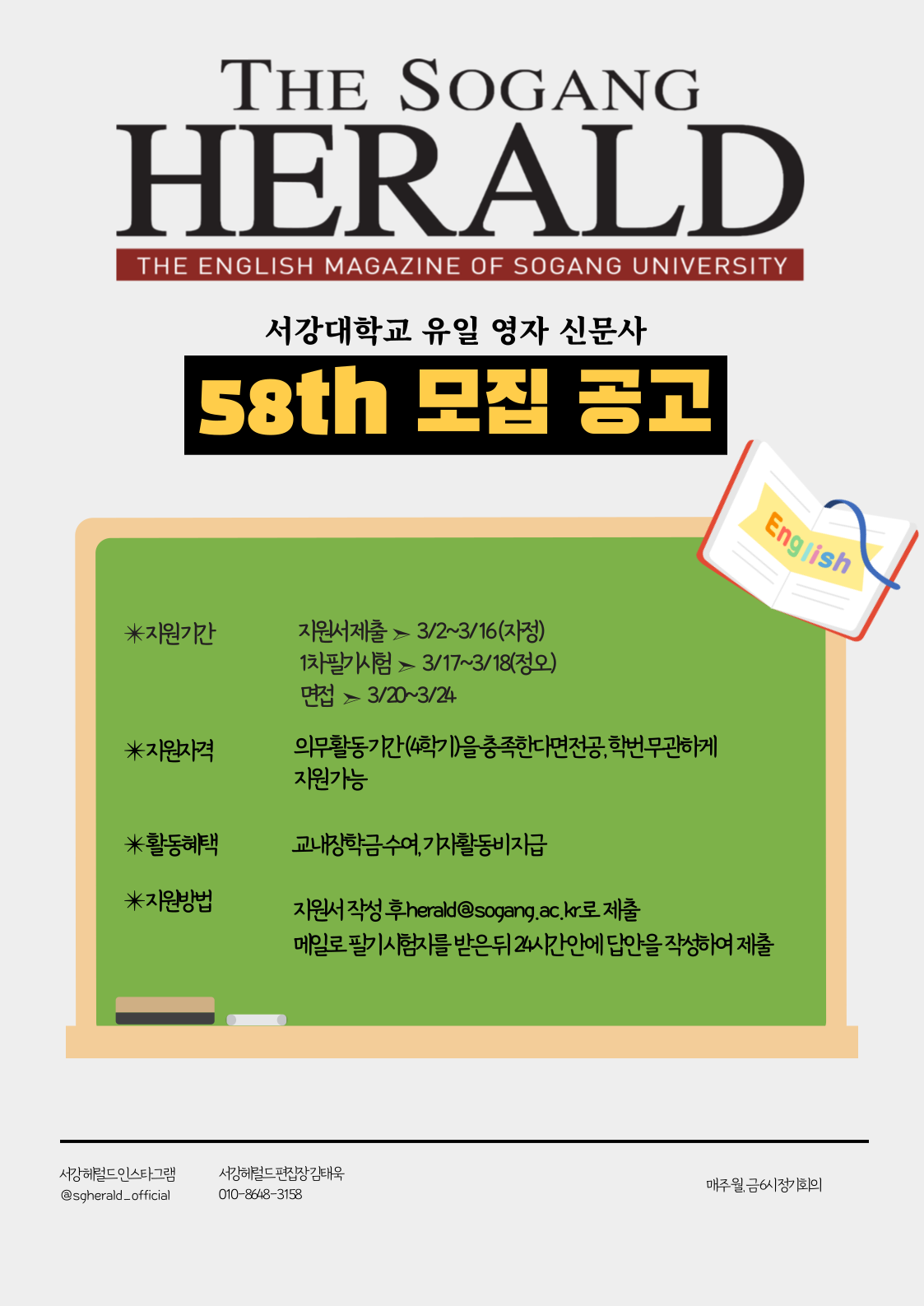 서강대학교 언론사협의체 소속 종합영자언론사 서강헤럴드에서 58기 수습기자를 모집합니다.