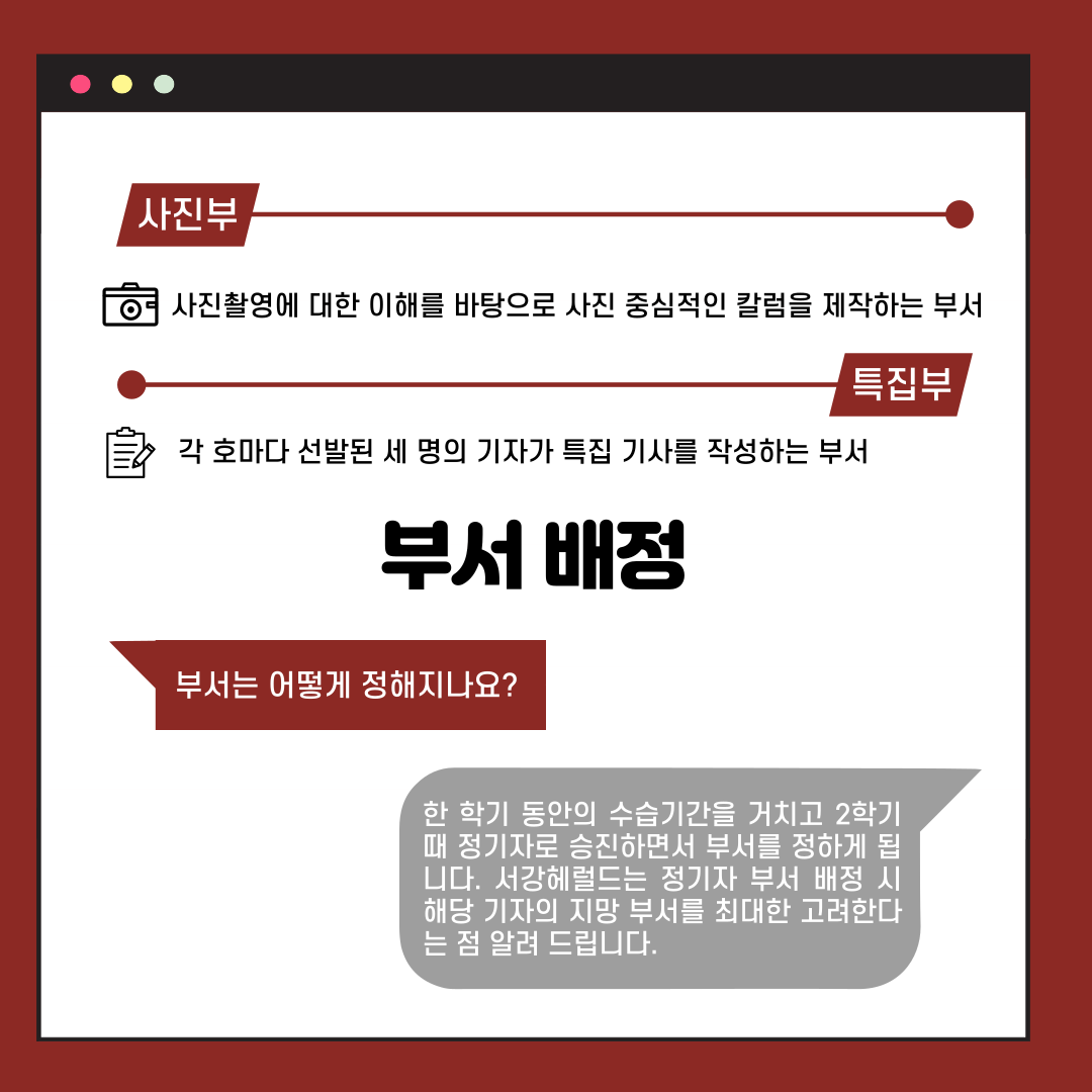 A. 한 학기 동안의 수습기간을 거치고 2학기 때 정기자로 승진하면서 부서를 정하게 됩니다. 서강 헤럴드는 정기자 부서 배정 시 해당 기자가 입사 시 표기한 지망 부서를 최대한 고려한다는 점 알려드립니다.