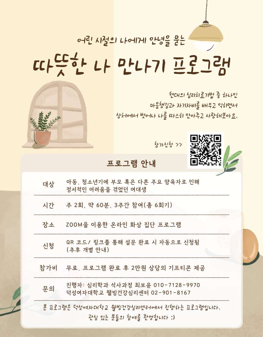 저희 웰빙건강심리센터에서는 아동·청소년기에 부모 혹은 다른 주요 양육자로 인해 정서적인 어려움을 겪었던 경험자를 대상으로 따뜻한 나를 만나는 자기자비 화상 집단 프로그램의 참가자를 모집하고 있습니다.