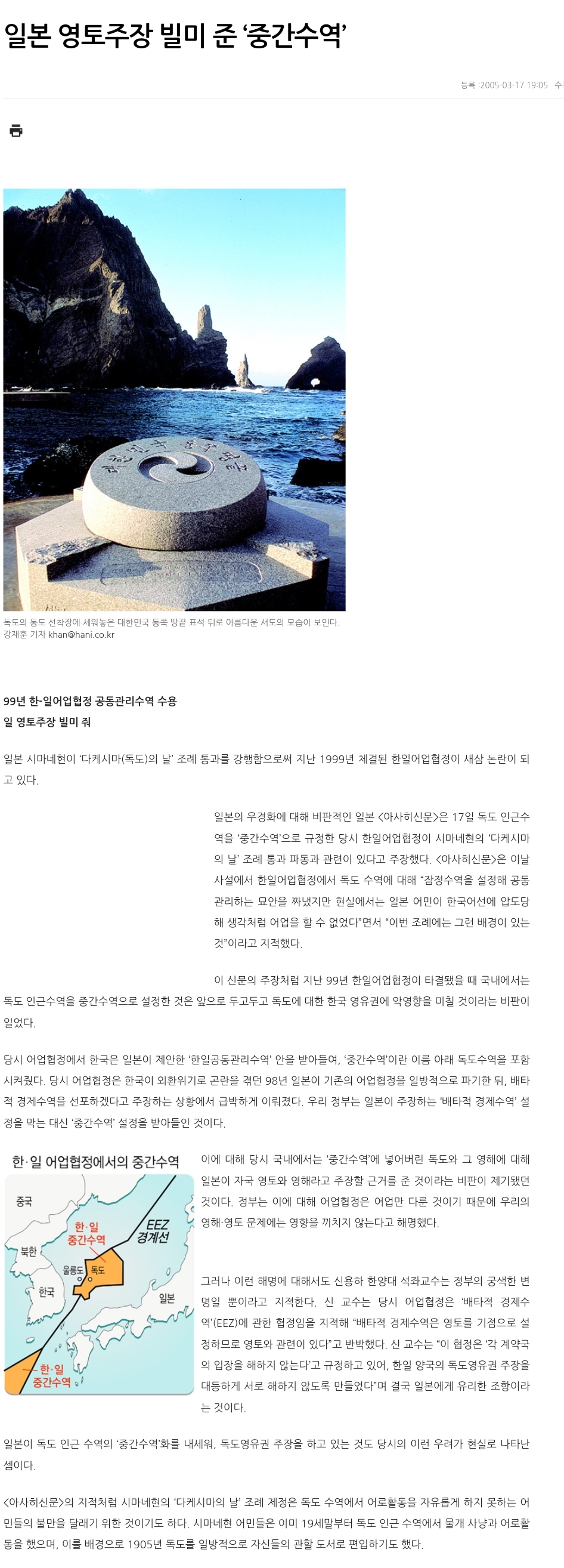 한일어업협정이 문제가 되는 점은 독도가 일종의 "중간수역"에 포함된다는 것이다. 한국에서 주장하는 독도 기점 EEZ와 일본에서 주장하는 독도 기점 EEZ에서 겹치는 부분이 중간수역으로 정해진 것. 이 협정에 대해 '독도는 명확한 한국령인데 무슨 조치이냐', '일부라도 독도 관련 권리를 내준다는 것이 향후 영유권 문제에 불씨가 될 가능성이 크다'는 반응이 들끓었고, 어민들은 헌법소원을 제기하였다.[40]